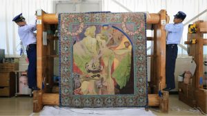 左:完成時のようす 中央・右:《堺緞通「クオ・ヴァディス」(部分)》2022-24年 羊毛、木綿 堺 アルフォンス・ミュシャ館(堺市)蔵
