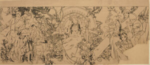 1900年パリ万国博覧会でミュシャが手掛けたボスニア・ヘルツェゴビナ館の壁画。その貴重な下絵2点(1402×3160・1390×1999)とタペストリーを組み合わせて再現します。 さらにオーストリア館に展示された彫像《ラ・ナチュール》、幻のパヴィリオン、人類 館構想時に制作されたとされる彫像《岩に座る裸婦》も合わせて公開します。